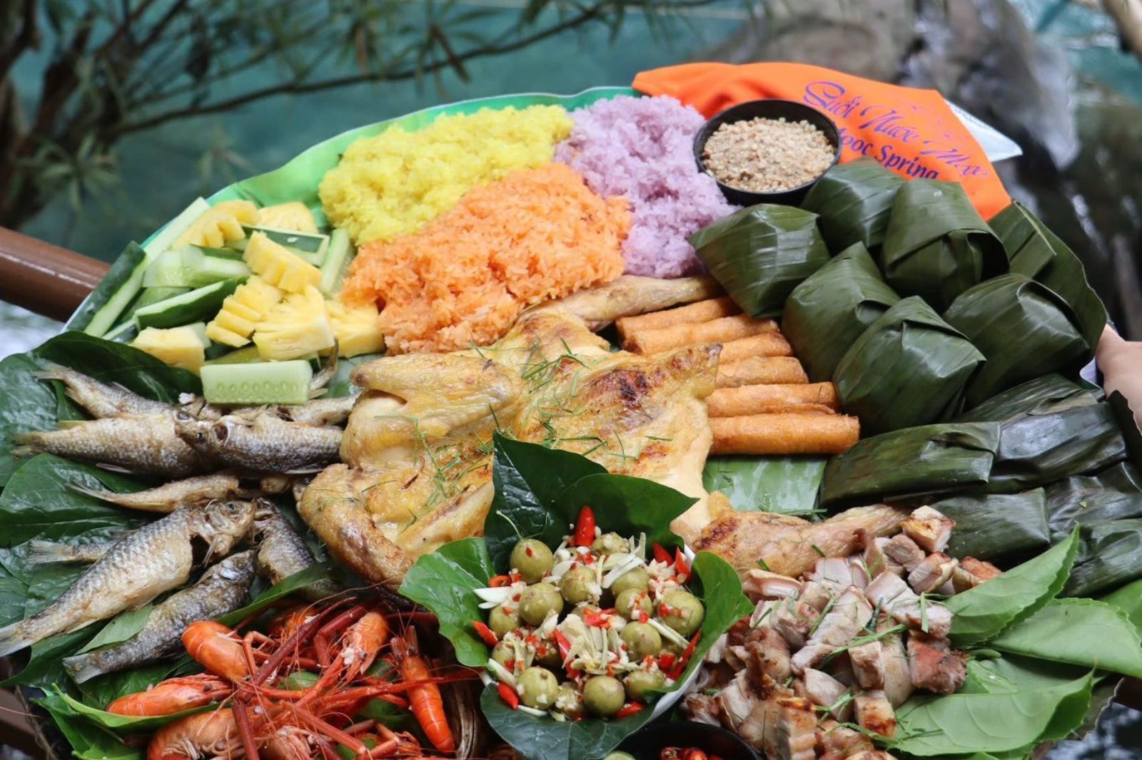 Điểm nhấn lớn nhất là cách trình bày và thưởng thức: hầu hết các bữa ăn được bày biện trên mẹt tre hoặc mẹt lá chuối truyền thống, ăn tại những chòi nhỏ bên bờ suối, dưới tán rừng xanh mát. Nhiều du khách còn được khuyến khích ăn bốc sau khi rửa tay sạch – một phong cách dân dã, gần gũi, giúp tăng thêm trải nghiệm văn hóa địa phương. Không gian ăn uống hòa quyện với tiếng suối róc rách, tiếng chim rừng, tạo cảm giác thư giãn, tái tạo năng lượng sau khi vui chơi dưới nước.