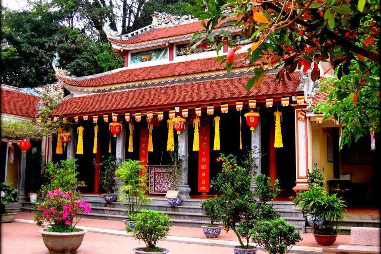 Khuôn viên chùa được bao phủ bởi cây cổ thụ, bonsai và dây leo, tạo không gian xanh mát, yên bình. Từ chùa, du khách có thể chinh phục 72 bậc thang đá rêu phong (chia thành 5 cấp) để lên đỉnh núi Non Nước, nơi tọa lạc Nghinh Phong Các, điểm ngắm toàn cảnh sông núi, làng quê Ninh Bình đầy thơ mộng.