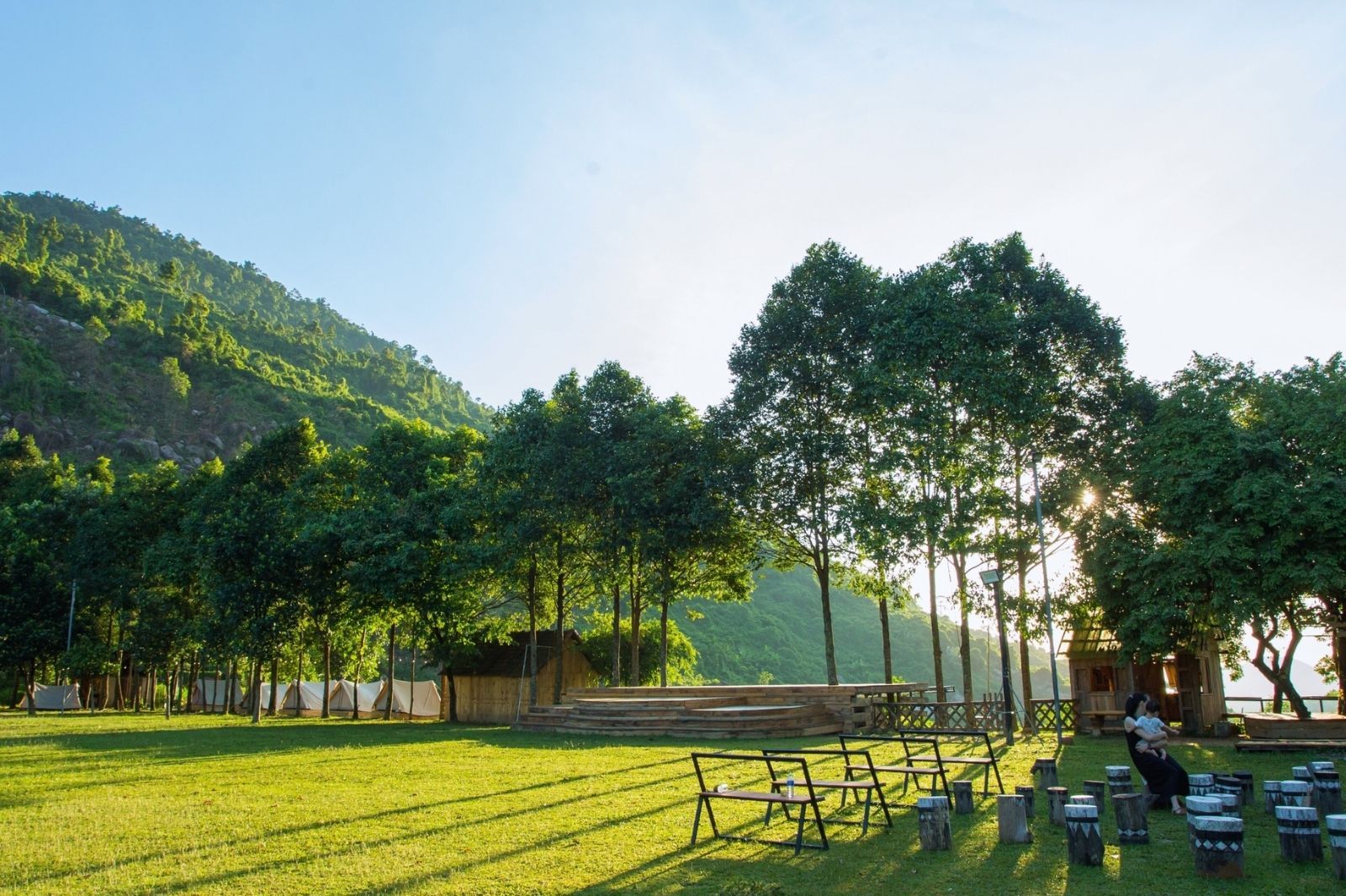 Glamping (lều cao cấp) • Giá: 1.200.000đ – 1.800.000đ/lều • Ghi chú: Phù hợp 2–4 người, có điện, quạt và WC riêng.