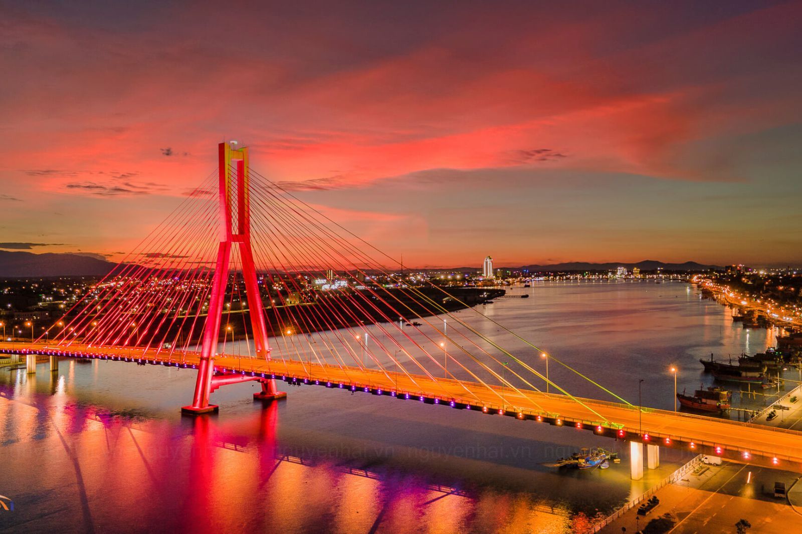 Chỉ cách Biển Bảo Ninh một quãng đường ngắn, Cầu Nhật Lệ hiên ngang bắc qua cửa sông Nhật Lệ, nối liền trung tâm thành phố Đồng Hới với bán đảo Bảo Ninh. Đây không chỉ là công trình giao thông quan trọng mà còn là một biểu tượng kiến trúc hiện đại của Quảng Bình. Cầu Nhật Lệ gây ấn tượng với thiết kế dây văng mềm mại, những trụ cầu cao vút vươn mình ra biển cả. Đặc biệt vào ban đêm, khi cầu được thắp sáng, vẻ đẹp lung linh càng trở nên huyền ảo.