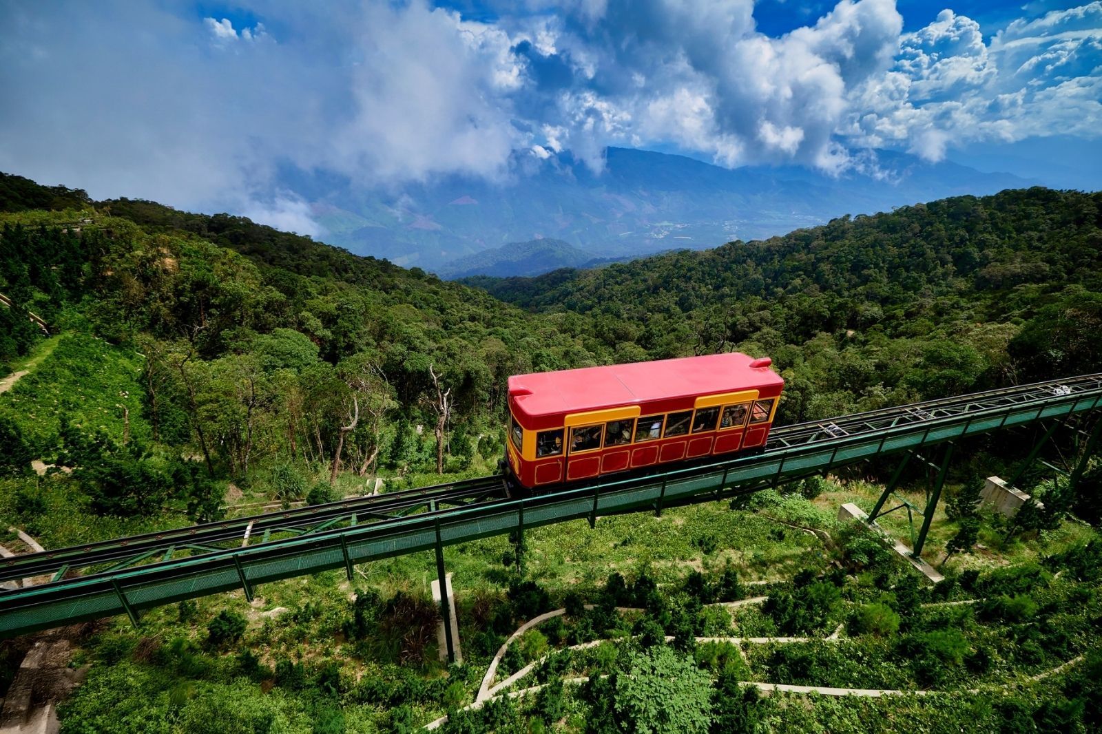 Tuyến tàu hỏa leo núi tại Bà Nà Hills dài khoảng 1,3 km, băng qua 9 đường hầm và 6 cây cầu sắt độc đáo, đưa du khách từ ga Pháp lên đỉnh núi trong hành trình ngắn nhưng đầy ấn tượng. Ngồi trên tàu, bạn có thể chiêm ngưỡng khung cảnh rừng nguyên sinh xanh mướt, hít thở không khí trong lành và cảm nhận cảm giác phiêu lưu giữa thiên nhiên hùng vĩ. Đây là một trong những trải nghiệm đáng thử nhất tại Bà Nà Hills, mang đến sự kết hợp hoàn hảo giữa kỹ thuật hiện đại và vẻ đẹp tự nhiên hiếm có.